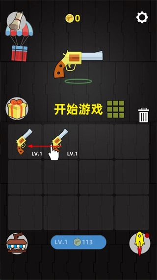 1、启动软件后呈现主界面,界面中央设有开始游戏按钮,下方配有武器合成提示,点击该按钮即可进入关卡。