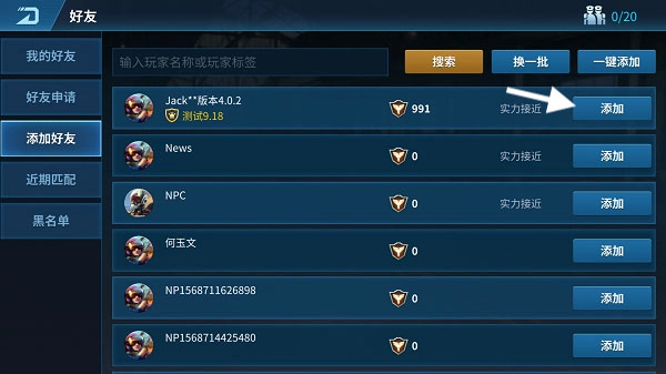 3、添加好友:在添加好友的页签里,系统会自动推荐部分玩家,玩家既能点击申请按钮发起好友申请,也能在输入栏中输入玩家的标签或名字来搜索并添加好友;