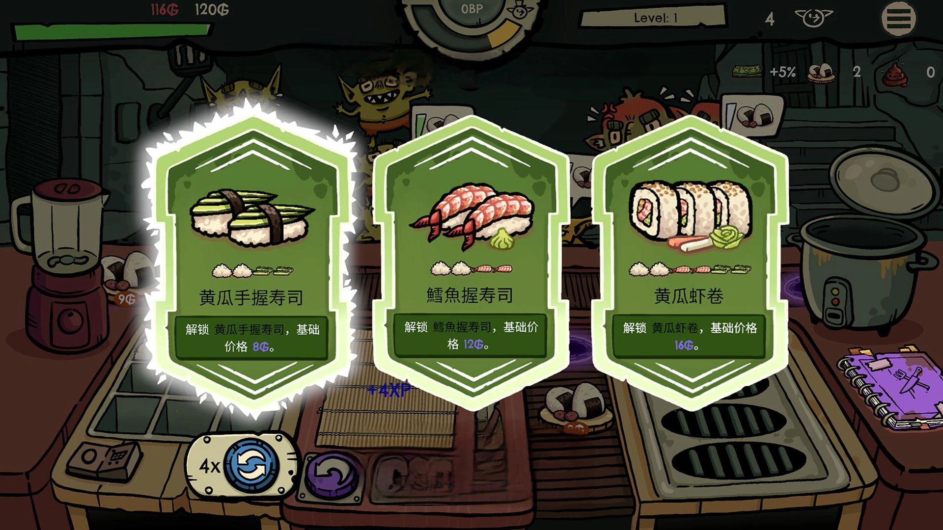 1. 以握寿司为起点,逐步开发更高级的菜品,每道新料理都要在满足特定条件后才能解锁。