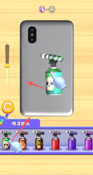 2、点击并拖动喷漆工具,在屏幕中央的手机壳模型上自由移动以完成上色,操作结束后点击“确认”按钮保存你的设计成果。