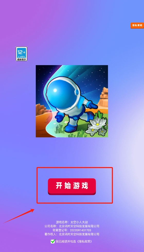 1、点击“开始游戏”开启太空冒险之旅,记得先勾选隐私政策,同时留意适龄提示信息。