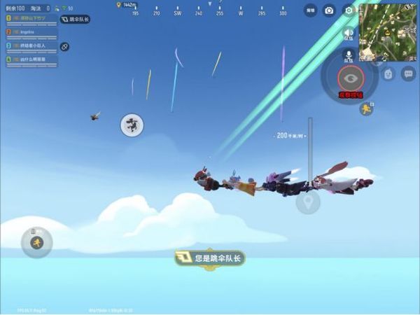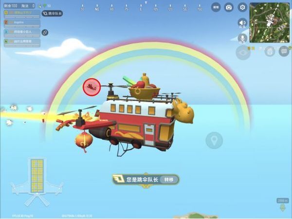 3、派对开启后,所有玩家将乘坐飞行巴士飞越派对地图上空,玩家只需点击屏幕上的跳伞按钮,即可自由选择降落位置。(跳伞前可点击右上角地图,在大地图上点击标记想要降落的地点)