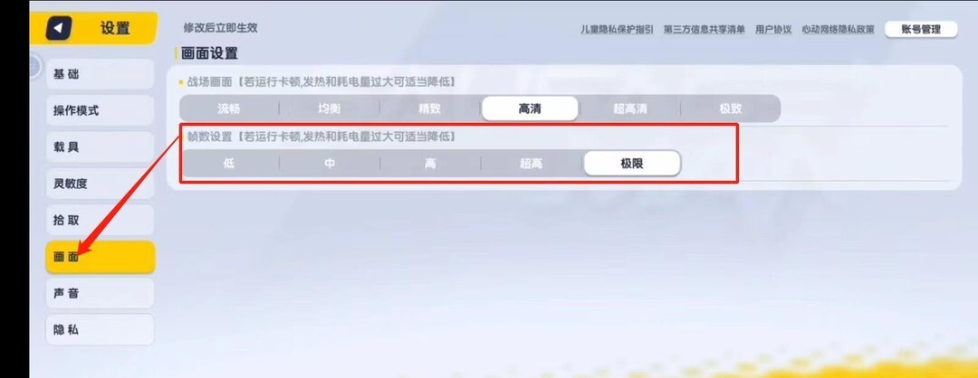 2、进入设置界面后,先点击左侧的“画面”选项;进入画面设置页面后,能看到帧数设置包含低、中、高、超高、极限五种可选档位,选择你想要的帧数档位进行设置就可以了。