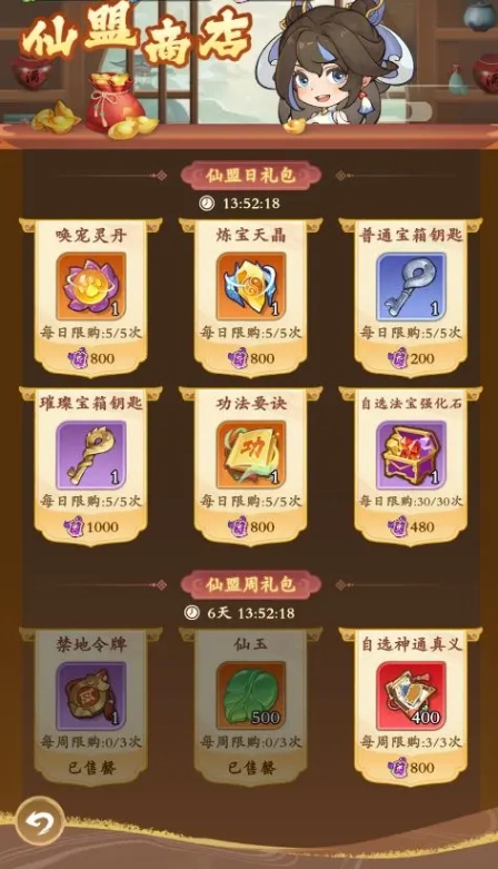 在仙盟里积累个人贡献,就能用这些贡献兑换丰富多样的奖励,连禁地令牌都能换到,帮道友们拿到更多装备来增强战力。这里面日礼包每天都会更新,周礼包则是每周更新一次,仙友们可以多关注商店界面的倒计时提示哦~