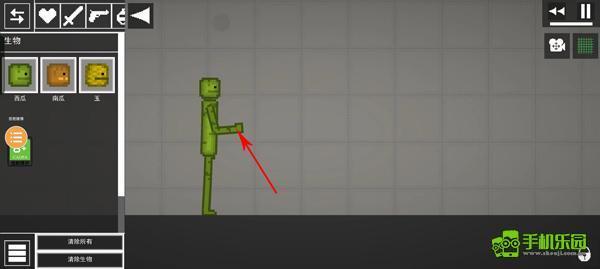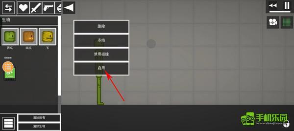 3、接着把胳膊抬起来,双击西瓜角色的胳膊,会弹出删除、冻结、静置碰撞、启用这些选项,选择冻结后,胳膊就会固定住不动了。