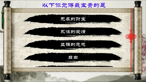 【2】以下你觉得最宝贵的是?无尽财宝:1000两银子。永恒爱情:福缘+15。坚强的意志:定力+15。自由:身法+15。至高无上的权力天赋:自我主义(减少队友属性,加自身属性。坑的越多加的越多)