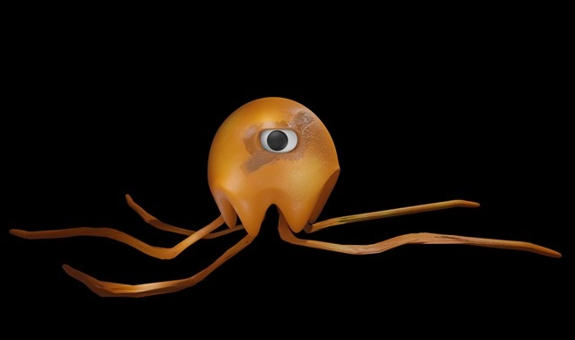 毒刺弗林是一只橙色的水母,钟形头部的正中央有一只眼睛,头部连接着六根能够伸缩的触手。其中四根触手自然下垂,另外两根则以友好的姿态举在头部两侧。