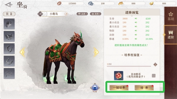 坐骑进阶可大幅提升坐骑属性和升级成长值。
