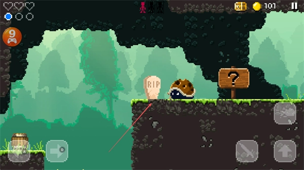 2、前往带有问号的木牌所在区域进行探索,在此过程中要避开蜗牛形态的敌人,同时注意那些标有“RIP”字样的危险地带,之后继续向前行进。