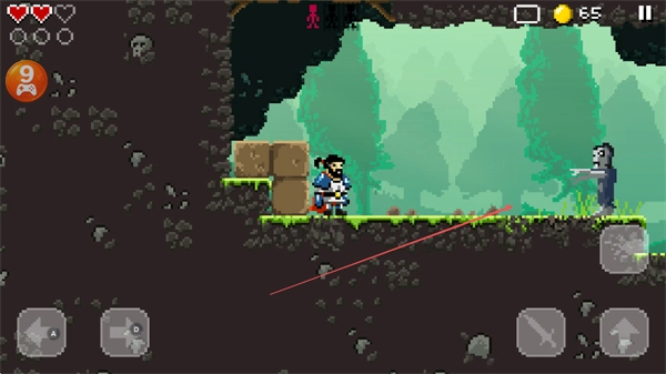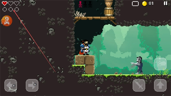 4、在多个平台构成的洞穴里移动,避开带有骷髅装饰的危险地带,攻击僵尸类敌人,收集金币,逐步推进关卡。
