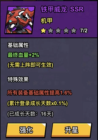 说明:该机甲虽然是SSR机甲,但随着登录天数的累计,装备基础属性加成会越来越高,后期甚至比UR机甲还强,建议优先获得,越早获得收益越大