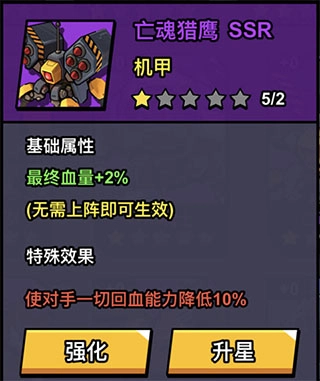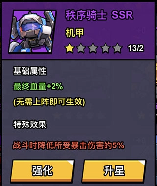 说明:该机甲同样,虽然是SSR机甲,但升星之后最高概率30%,运气好的情况下相当于带了一个比橙光芯片还要强的军械卡,该机甲建议优先升星,未升星前效果不明显。