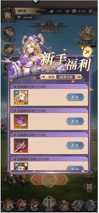 4:推图达到指定关数,即可领取通关奖励与新手福利。