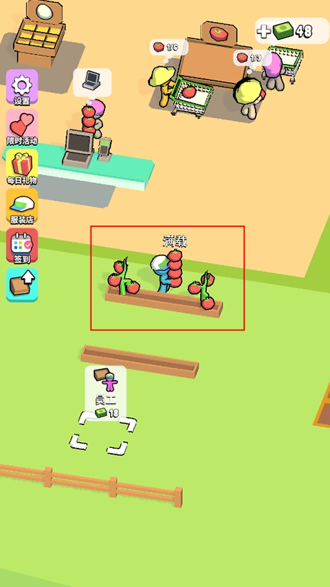 当顾客完成选购后,会在结账区域等候,玩家需要前往结账处,把商品装入容器递给顾客,即可获得相应的金币奖励。