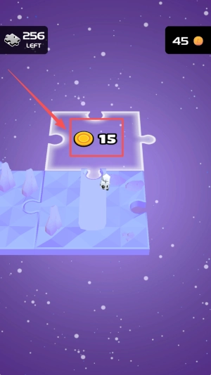 当留意到左上角呈现“256 LEFT”字样与拼图图标时,操控小机器人在蓝色拼图区域行进,同时关注右上角45枚金币的收集目标以及中间数字15对应的任务需求。
