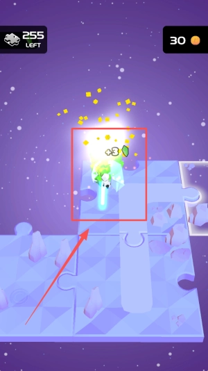 当小白人站在平台上,身上发出亮光并显示“+3”时,别停下,继续操控它移动去收集物品,同时留意左上角“255 LEFT”和右上角金币数量(当前显示30)的变化情况。