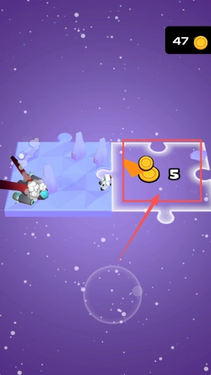 当画面中出现淡蓝色拼图和数字5时,根据箭头的指引点击这块拼图就能获取金币,需要留意的是右上角的金币数量会从47开始递减。