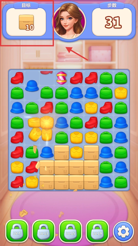 游戏里的目标是收集16个【箱子】,总步数为31步,需要消除箱子周边的元素来使其解锁或掉落,以此推进收集进度。