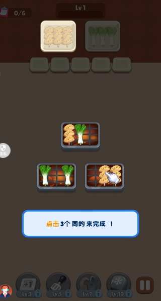 进入游戏后,你可以按照操作指引,点击三个相同的菜品来完成串烧消除。
