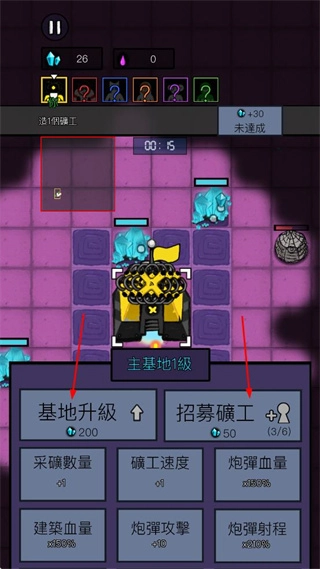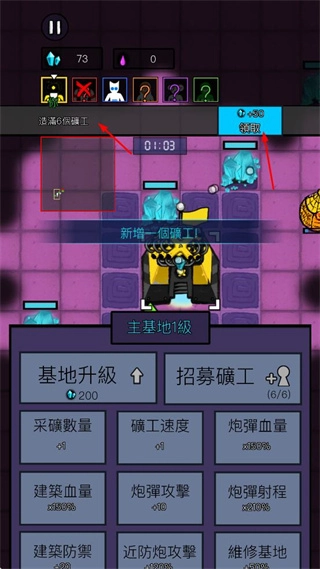 进入主基地界面后,你可以用水晶资源升级基地,以此提升基地的各项属性;同时也能招募矿工,增加采矿的人力。