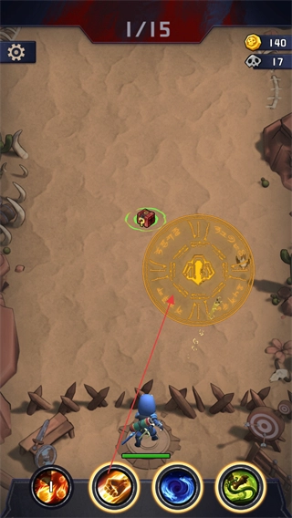 进入游戏关卡后,屏幕上方的“1/15”标识会显示当前的关卡进度,你只需点击下方的技能按钮,就能对前方的怪物发起攻击。