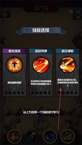 每完成一个阶段的战斗,就会弹出技能选择界面,你可以从暴击提升、追踪导弹这类技能里挑选一个,以此来增强角色的实力。