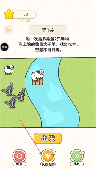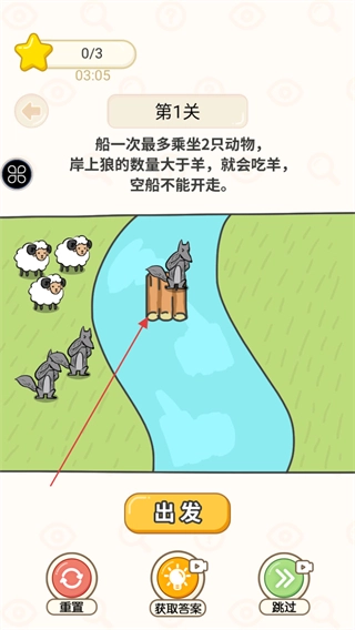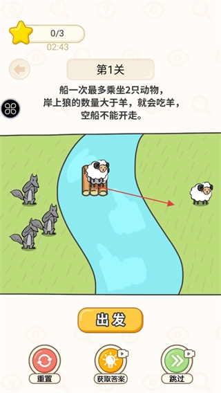 进入第1关,先来熟悉一下关卡规则:船每次最多只能载2只动物;如果岸上狼的数量比羊多,狼就会吃掉羊;空船是无法开动的;另外要留意屏幕上方的星星进度和倒计时。