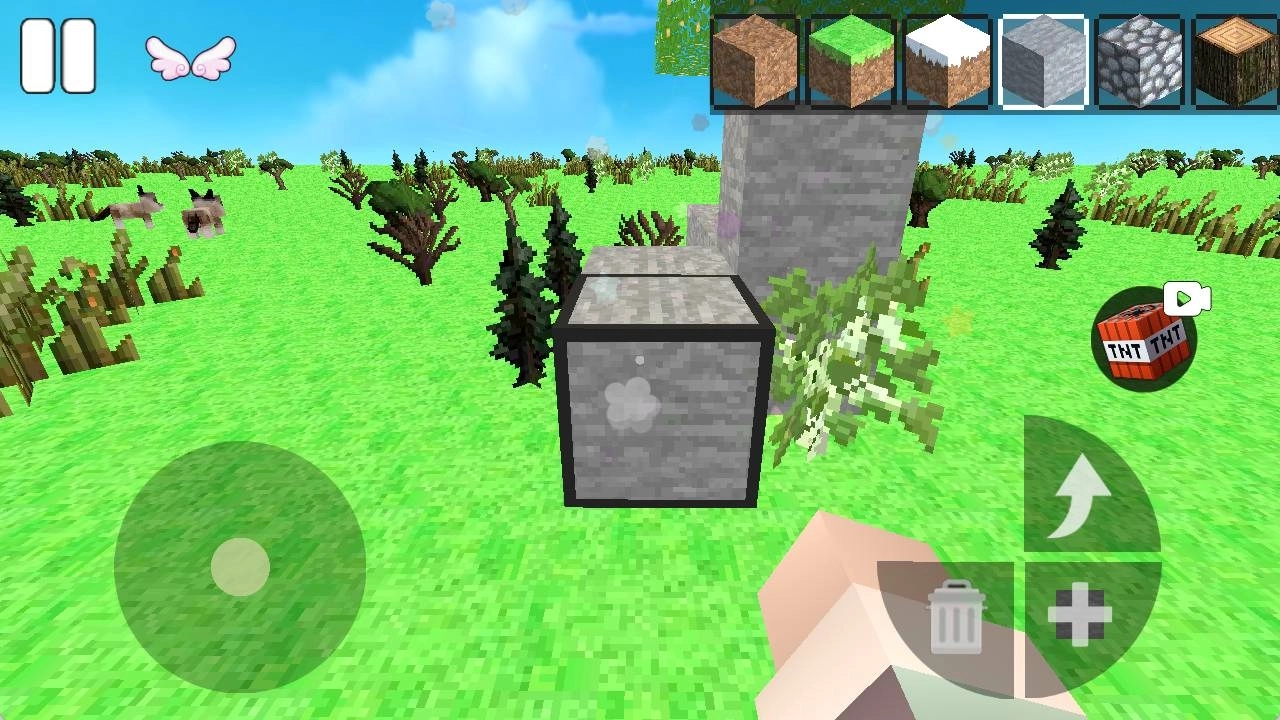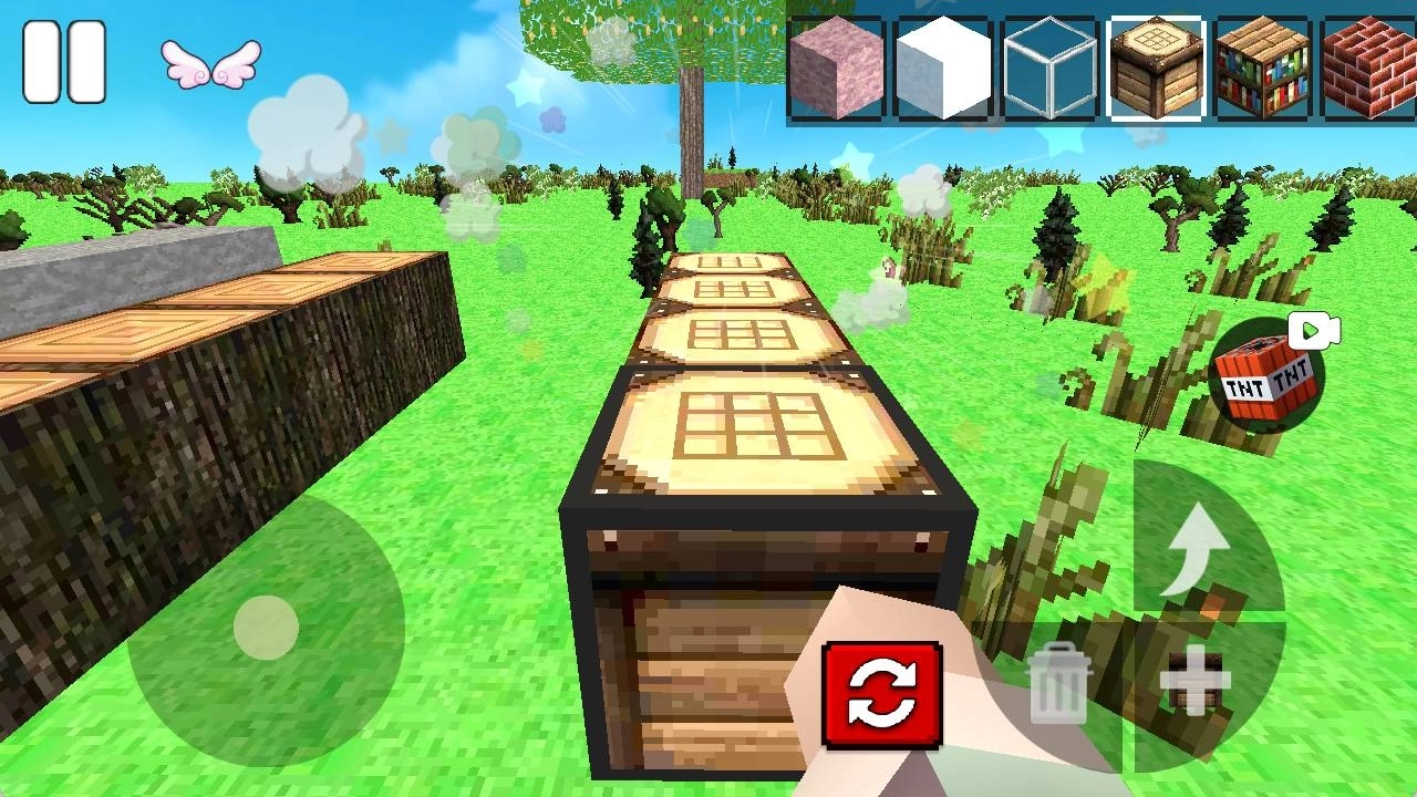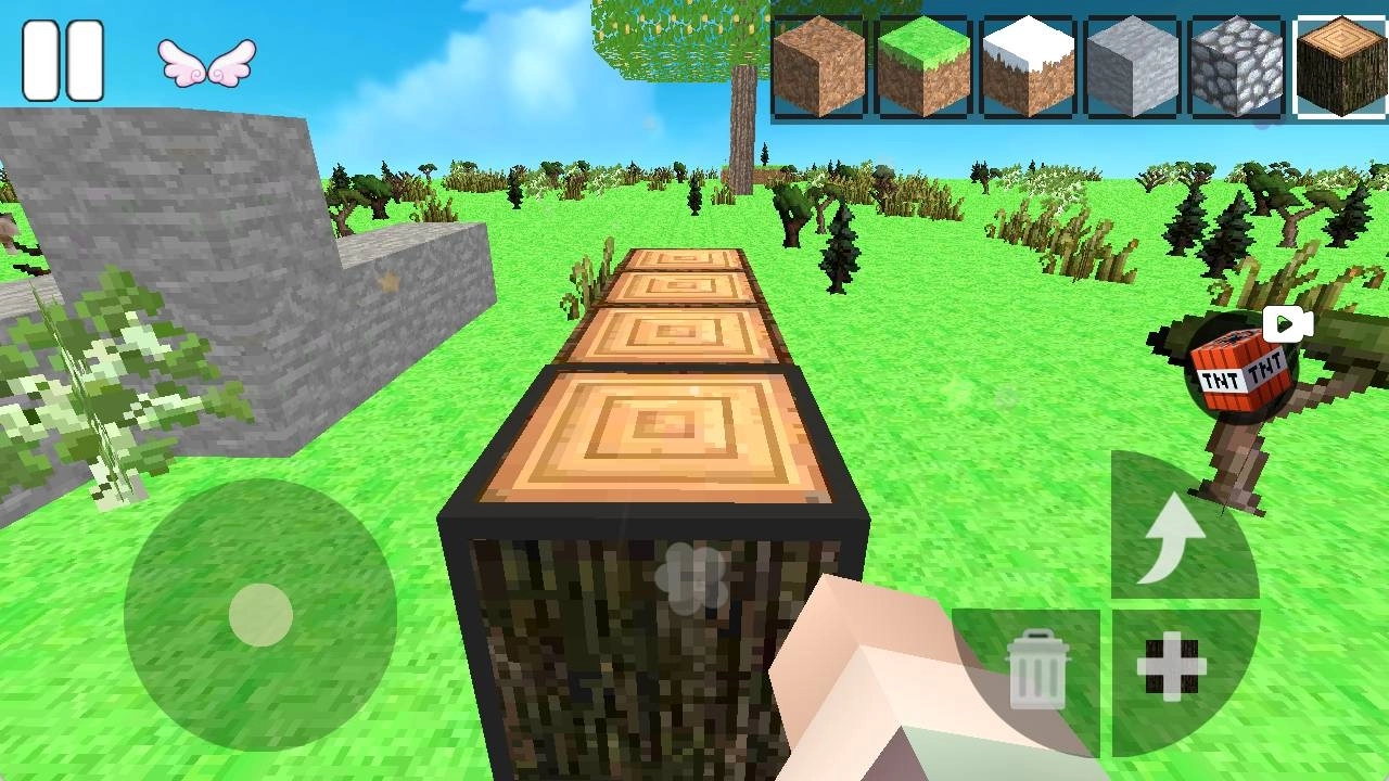 1、在像素世界里操控角色到处探索,收集木头、石头这类散落在各处的基础材料,为后续建造储备充足资源。