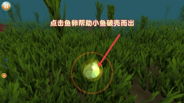 进入海底场景,开局按照提示点击鱼卵,帮助小鱼破壳而出,完成小鱼的孵化,进入海洋后,控制小鱼移动。