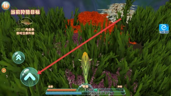 注意当前的狩猎任务,根据目标鱼特征包括外形和位置 ,在海草区搜索,利用冲刺快速接近,完成击杀升级。