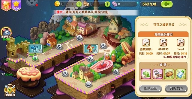 8、在冒险地图里,挑选带有绿色标记的关卡发起挑战,点击弹出框中的“开始战斗”或“组队匹配”按钮就能进入战场。
