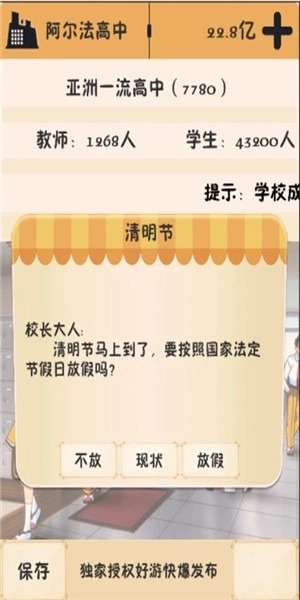 当校长可真不轻松,每天都得为大大小小的事劳心费神,还得时刻把准学校发展的大方向。无需费力操作,挂机就能轻松获取丰厚收益,让你沉浸式体验经营的独特魅力,而我们从中收获的远不止金钱这么简单。培育学子的核心目标,在于传承那份最珍贵的精神财富,用心守护好这片校园的每一处角落。