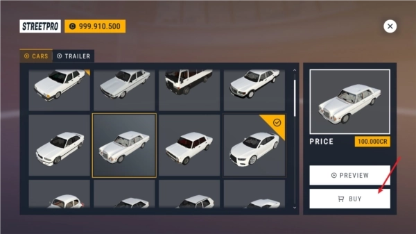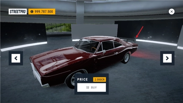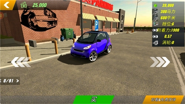 1、第一步是从主界面进入车库,这里陈列着不少可供选择的汽车,未解锁的车辆需要我们进行购买操作。