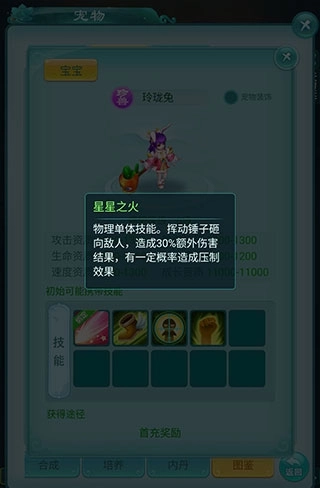 除了传统宠物之外,还有一类宠物特别适合萌新饲养,那就是珍兽。目前游戏里能获取的珍兽主要是充值礼包中的玲珑兔,只要稍微充点钱就能立刻获得,简直太简单了!玲珑兔的优势在于它的专属技能“星星之火”,不仅伤害可观还能压制敌人,外形更是超级可爱,反正瑶瑶对它喜欢得不得了~