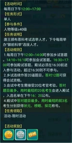 科举答题活动的流程借鉴了古代科举考试的模式,分为乡试、会试、殿试三个主要环节。所有等级达到40级的玩家,都能在每周日14:00至16:10期间参与乡试与会试;而在会试中表现出色的玩家,则可于16:30到17:00继续参加殿试,亲自接受皇帝的提问。