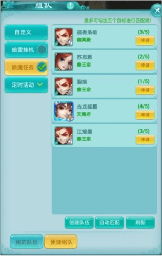 而且组队也特别简单,不管是自己当队长还是想加入别人的队伍,在世界频道喊一声或者点击组队界面的快速匹配功能,很快就能组到人啦。你是不是觉得封妖除魔的次数太多,完成起来太慢了呀?
