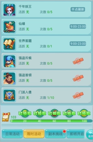 还有一些限时任务,像“强盗首领”“强盗斥候”“门派入侵”“幻境寻宝”之类的,早间或晚间的活动也得参与一下哦