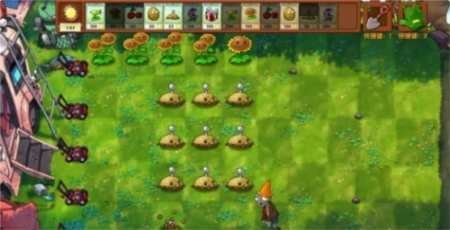 2、游戏开局时,我们要尽快种下向日葵和豌豆射手,这样能加快阳光的收集速度;要是有血量较高的僵尸靠近,那就先放个免费的土豆雷来暂时应对一下。