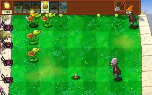 3、前期优先用豌豆和向日葵来布阵,等有了足够的火力,我们就可以开始建造坚果了。