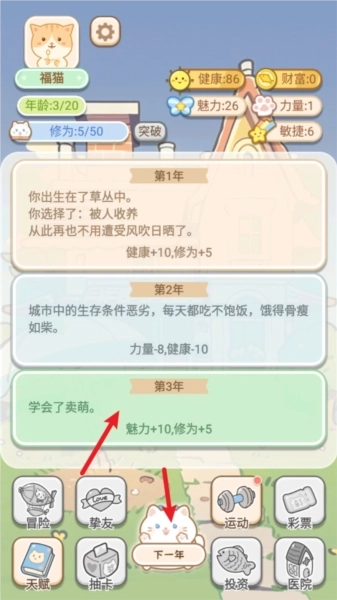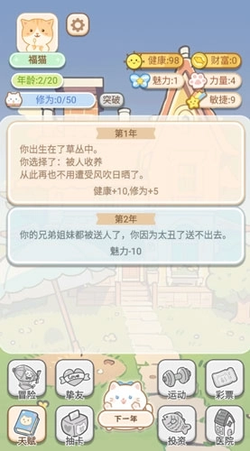 2、天赋与随机事件:游戏里,玩家得给猫咪挑选天赋,这些天赋会对猫咪的成长和生存能力产生影响。此外,游戏还设计了多样的随机事件,像天气转变、疾病来袭等,玩家要灵活处理这些事件,助力猫咪顺利成长。