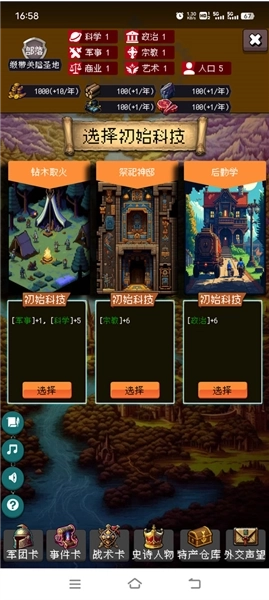 3、接着挑选初始科技,目前有钻木取火、祭祀神邸、后勤学这三种可供选择;