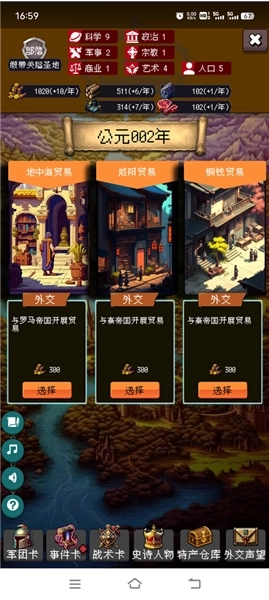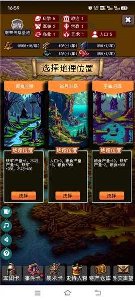 3、军团卡:军团卡的重要性不言而喻,它是你的国家在对抗敌人时的核心战力支撑。每隔十年,就会有外部势力对国家发起入侵,你必须依靠军团卡来击退这些入侵者,不然你的领土和人口都将不复存在。
