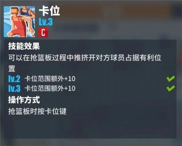 卡位:可以在抢篮板过程中推挤开对方球员占据有利位,C基础技能之一。卡位细节需要多加练习,寻找一个好的卡位位置很重要!