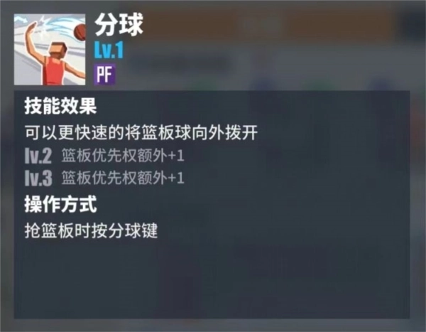 分球:可以更快速的将篮板球向外拨开,C基础技能之一。分球的优先更高,在某些情况下,卡位卡到对位球员了,但是篮板还是被对方拿走了,适当利用分球,可以在抢篮板中获利。