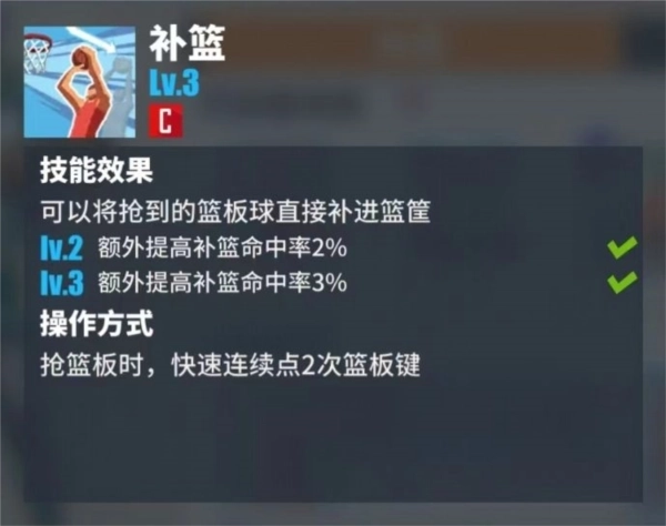 补篮:可以将抢到的篮板球直接补进篮筐,C基础技能之一。通过补篮可以抢到一些原本可能抢不到的篮板球,并且快速进攻得分。