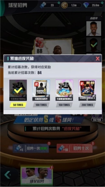 玩家可根据累计招募次数领取对应奖励:累计招募满100次,可获得S球员自选包;累计招募满200次,可获得SS球员自选包!