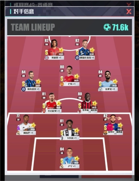 点击右上角的“显示对手阵容”按钮,就能查看对方的球员配置与阵型啦~仔细观察对手的阵容和战力情况,能帮助你更快地做出针对性调整。