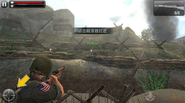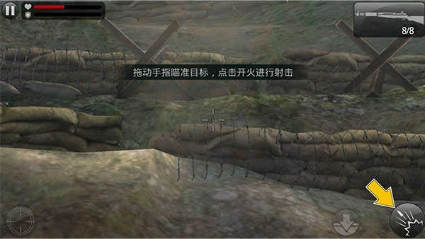 然后,右边还有一个向下的箭头按钮,用于蹲下躲避;右下角的按钮则是用来开枪的。另外在《火线指令》中,玩家配备了狙击枪和机枪两把武器,右中部有个按钮可以灵活切换枪支。游戏里子弹会自动上膛,玩家也能通过点击屏幕手动完成上弹操作。