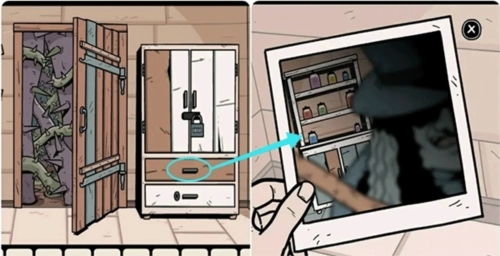 1、先从抽屉里取出一张照片,照片里女巫身后的架子上有我们需要的提示。