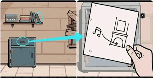 3、进入楼梯间,取走架子上的蓝色「笔记本」,接着打开保险箱上层的抽屉,查看里面的纸条,纸条提示我们需向烟囱播放音乐。